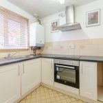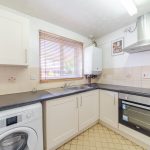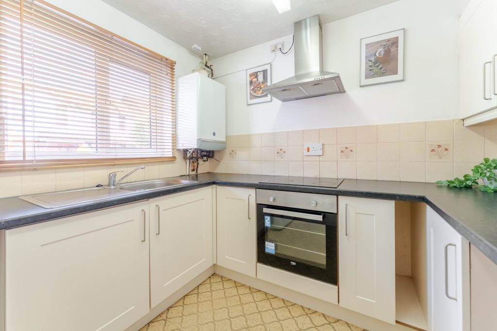 * Kitchen (approx. 9’10” x 7’6″) – fitted with a range of base and wall units, work surfaces, and some integrated appliances. Window to the front aspect.